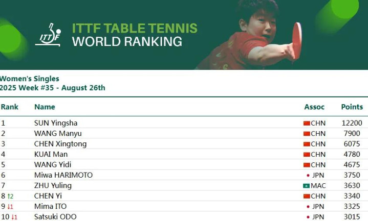 北京时间8月26日,国际乒联更新了2025年第35周的世界排名。其中,孙颖莎在WTT欧洲大满贯瑞典站女单夺冠后,成为WTT大满贯赛事首位单打四冠王,也成为乒乓球史上首位世界排名积分突破12000分的运动员。