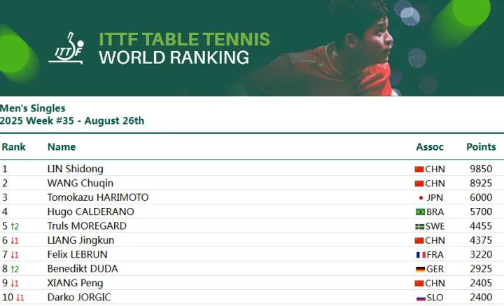 男单方面,林诗栋、王楚钦、梁靖崑和向鹏进入前十名。林诗栋9850分位列第一,王楚钦8925分位列第二,日本选手张本智和位列第三,巴西选手雨果·卡尔德拉诺位列第四,刚刚在WTT欧洲大满贯瑞典站夺得男单冠军的莫雷加德世界排名升至第五,梁靖崑位列第六,第七到第十位分别是菲利克斯·勒布伦、杜达、向鹏和达科·约奇克。