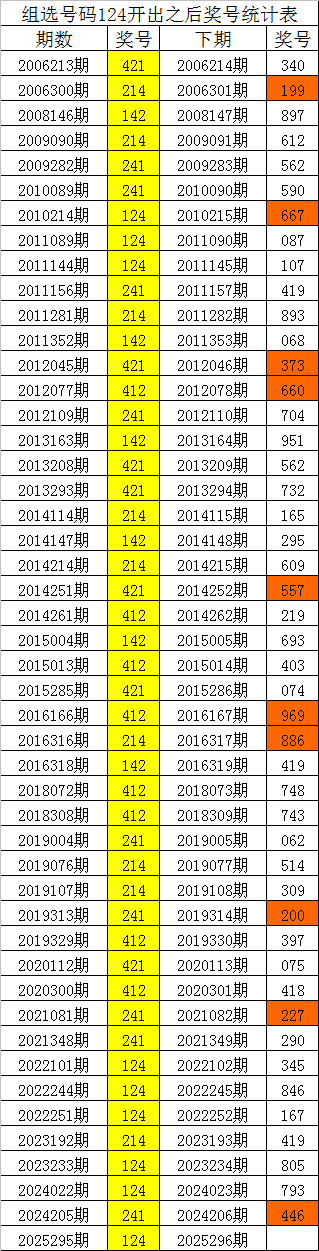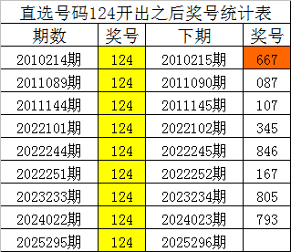 从上表统计可以看出,直选号码124开出之后,其下期奖号:
