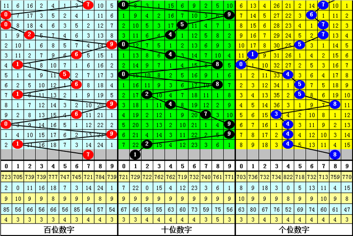 中位跨度分析:最近3期中位分别开出奖号9-9-2,最近两期跨度分别开出0、7,中位号码历史上连续两期跨度开出0、7的奖号共开出55次,其前两次奖号开出: