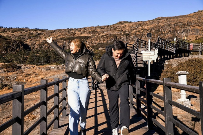 12月7日,行程转向“春城”昆明。虽然轿子雪山还未被深雪覆盖,但高山巍峨的景象,已让夫妇二人连连惊叹。“这里和缅甸的山完全不同,开阔、峻朗,像是站在天空的门口。”Yi迎着山风说道。
