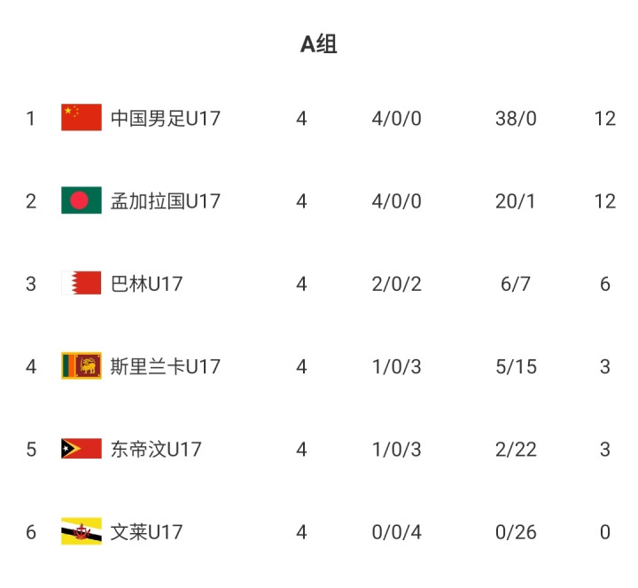 目前两队均为4战全胜积12分,但中国队在净胜球方面有巨大优势,中国队净胜球为38个,而孟加拉国只有19个。凭借多出19粒净胜球的巨大优势,末轮比赛,中国队只要打平孟加拉国,就能锁定小组头名。但相信面对“打平即出线”的理想结果,中国U17男足的小伙子们,还是希望能用一场大胜,以5战全胜的出色表现,为本届亚预赛圆满收官。