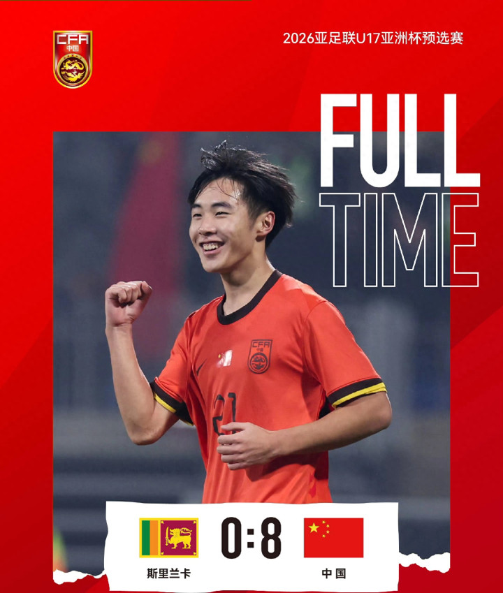 北京时间11月28,U17亚洲杯预选赛第4轮,U16国足8-0斯里兰卡U16,取得小组赛四连胜。本场比赛,中国队多点开花,替补出场的万项两分钟内打入两球,赵松源、张旭尧、邝兆镭、何思凡、帅惟浩、张伯霖各有一球进账。另一边的孟加拉国U16则以2-1击败巴林U16。